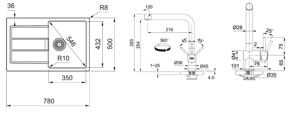 Lavello in tectonite Sirius 2.0 S2D 611-78, per il montaggio sopra top