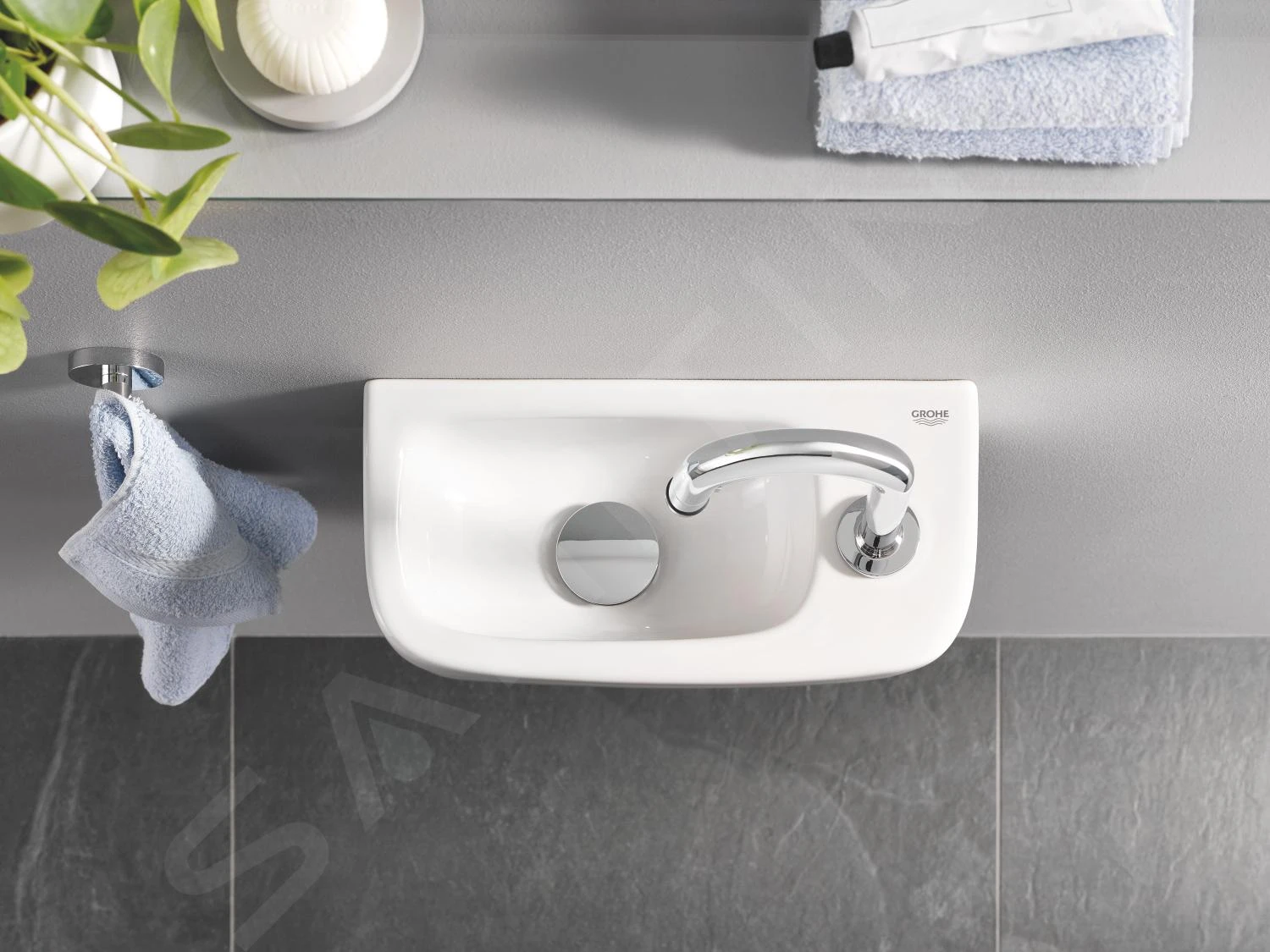 A prima vista, colpirá sicuramente per le sue dimensioni incredibilmente ridotte, ma presto rimarrete abbagliati dal design moderno e senza tempo, dai dettagli di prim’ordine, dall’ottimoa integrazione con lo spazio e dall’elevata praticitá. E queste sono solo alcune delle qualitá di questo lavabo. Le superfici lisce bianche con trattamento Alpine White manterranno il loro aspetto lucido per molti anni. Questo effetto evoca pulizia e leggerezza, che rende la stanza piú leggera e otticamente piú piccola. Le linee minimaliste del lavabo compatto fanno risaltare gli altri elementi del bagno. Ecco perché è ottimo per l’uso in tutti gli stili di bagno. Tuttavia, una colonna non é consigliata per questo lavabo. Si abbina perfettamente ai rubinetti GROHE Eurostyle ed Eurosmart