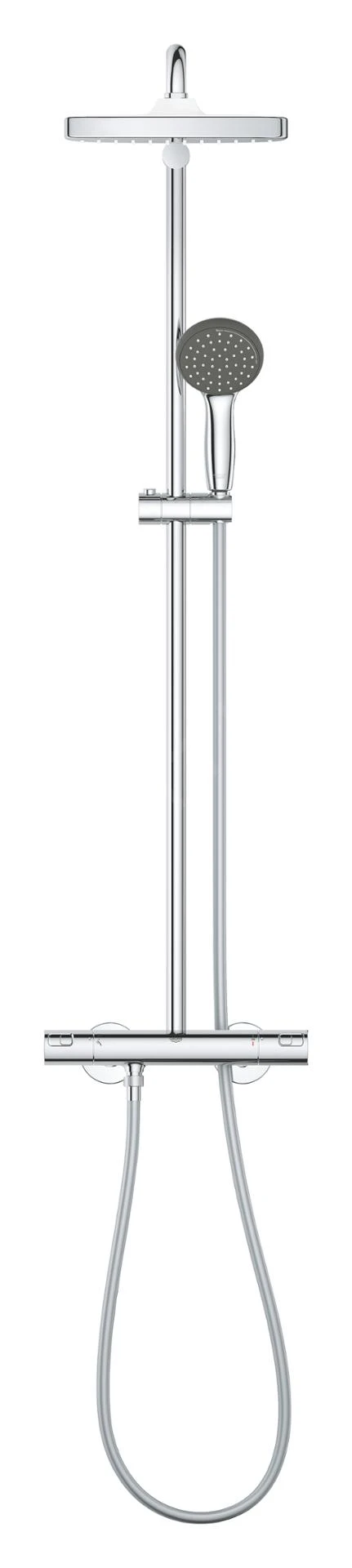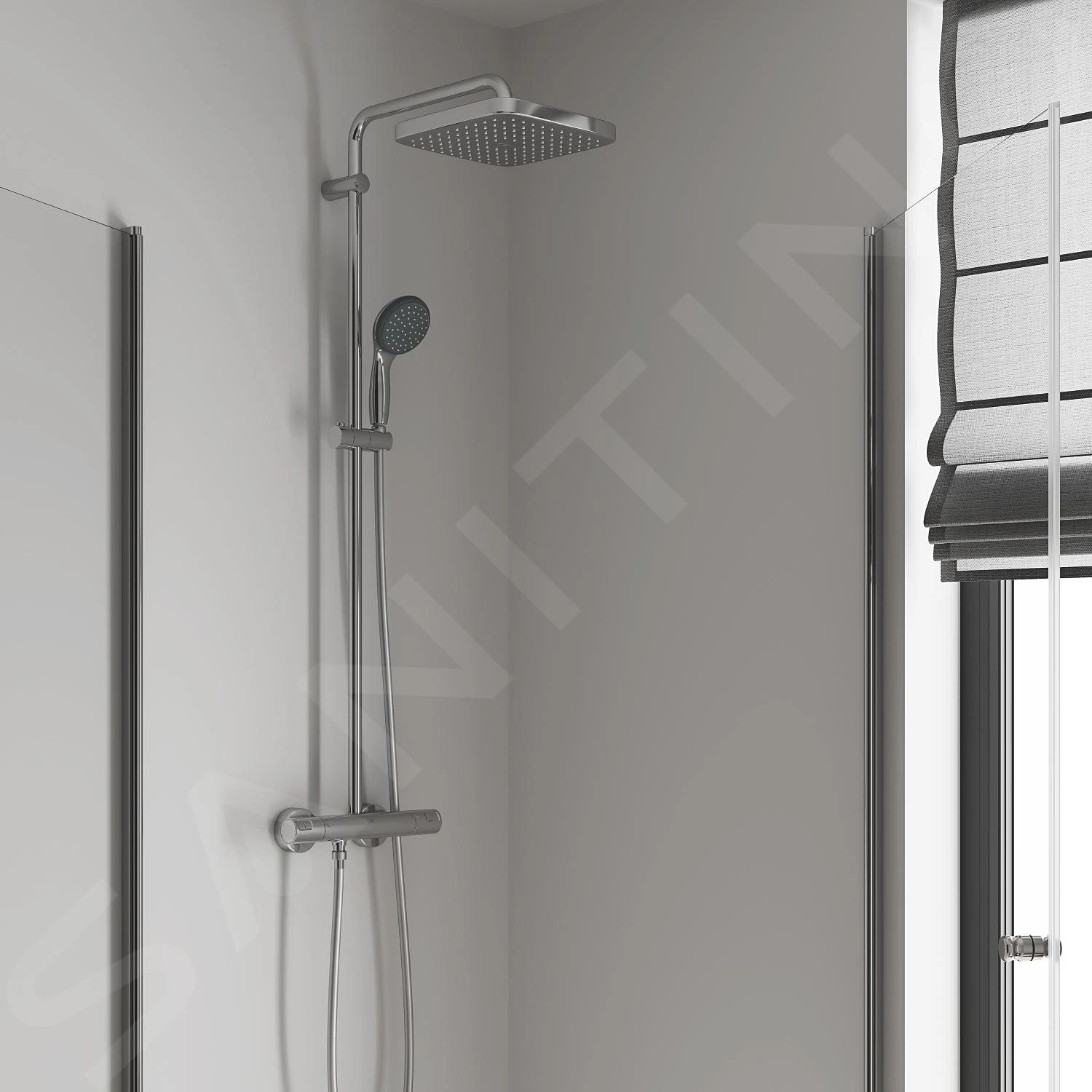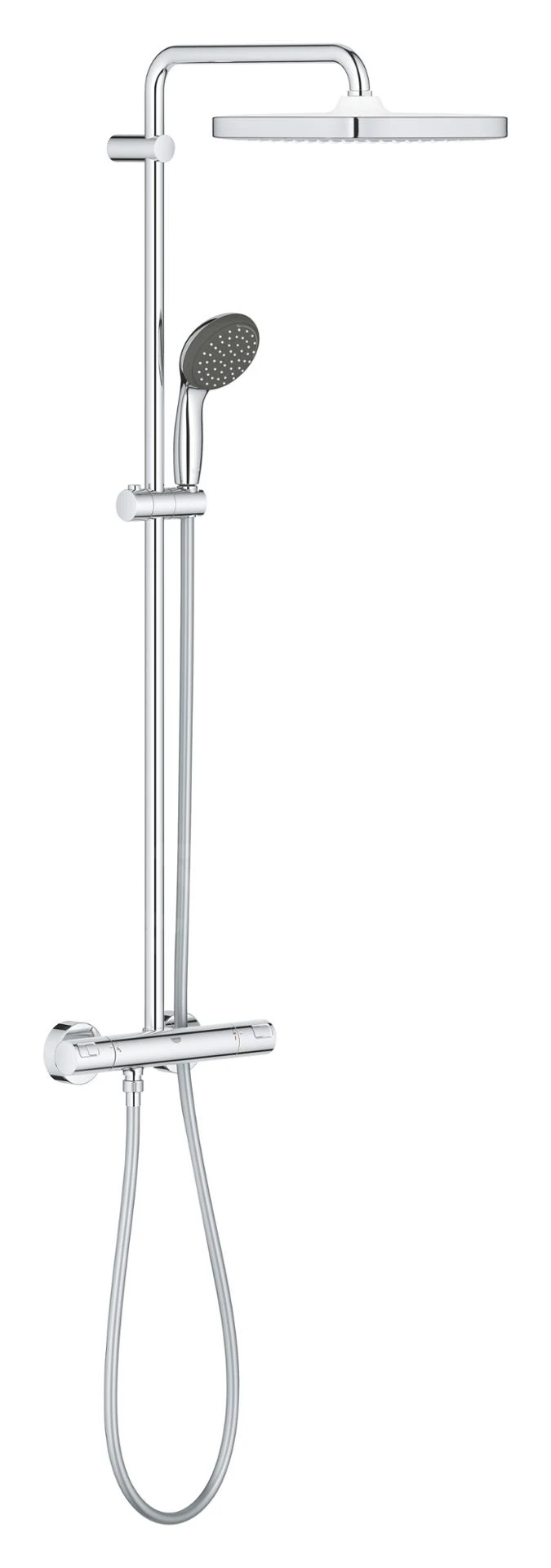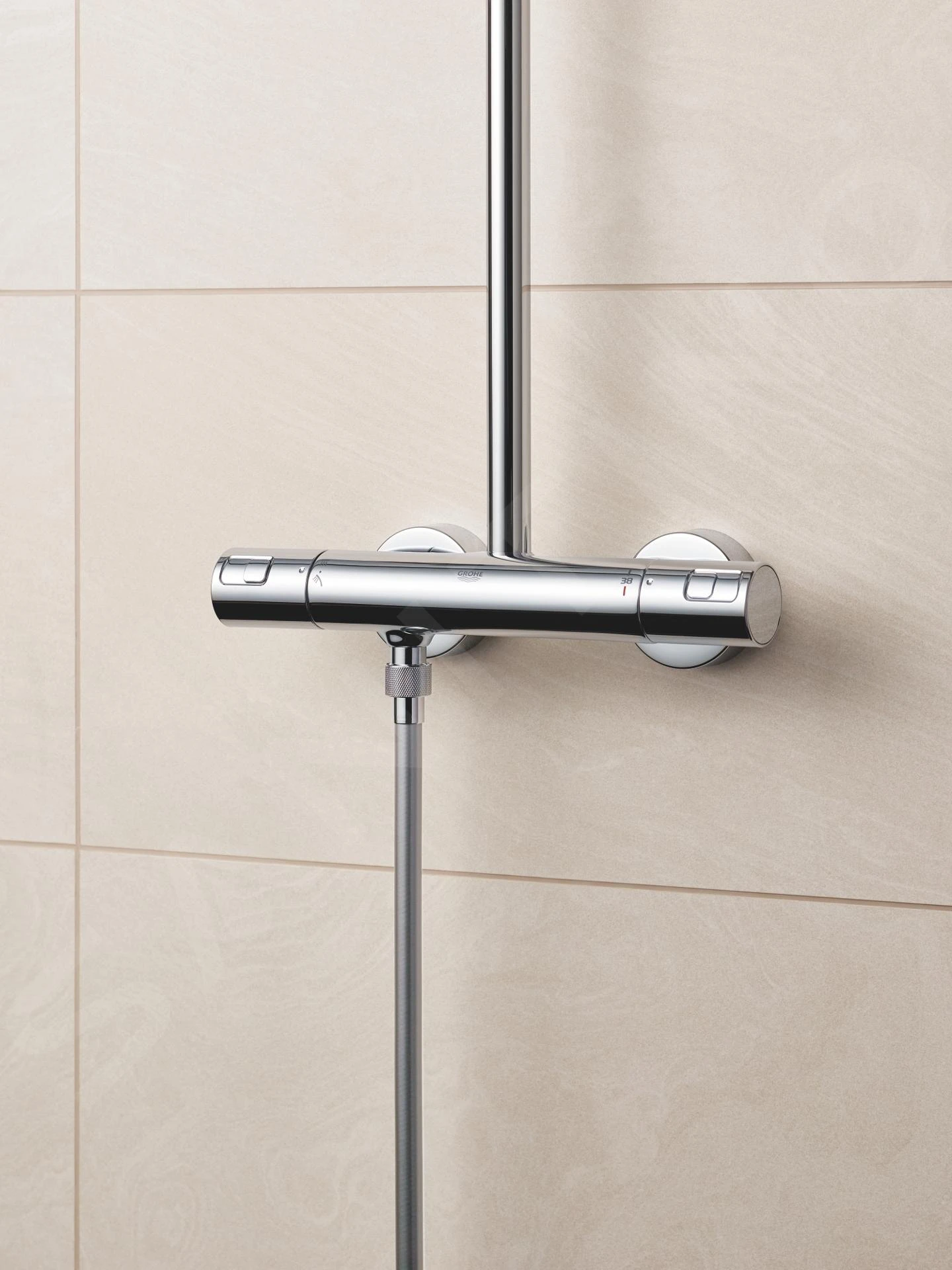 L’esclusivo set doccia GROHE Vitalio Start colpisce non solo per il suo aspetto, ma anche per le sue prestazioni e affidabilità. L’intramontabile combinazione di termostato a parete, doccetta e soffione offre una perfetta pulizia e cura. Il set doccia si basa su linee arrotondate collaudate, che sono accentuate da superfici cromate moderne e brillanti. Il soffione gioca con un design quadrato con bordi arrotondati. Le superfici sono protette contro i danni meccanici grazie alla tecnologia GROHE StarLight, che impedisce anche il deposito di gocce d’acqua e la formazione di calcare, rendendo la manutenzione molto più facile.
